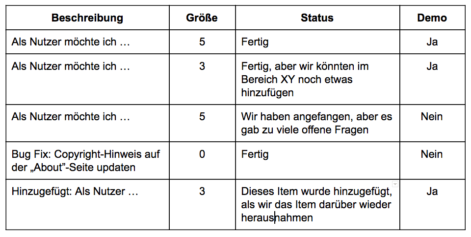 Der erste Punkt in der Tabelle ist eine Beschreibung des jeweiligen Items. Dort wird eine User Story oder eine andere Beschreibung eingefügt. Als nächstes kommt die Größe der Items – meist in Story Points. Danach kommt der Status der Items. Hauptsächlich geht es darum, ob sie fertiggestellt sind oder nicht. Aber alles andere, was in der Hinsicht wichtig erscheint, kann dort auch hinzugefügt werden. Die letzte Spalte gibt an, ob das jeweilige Item demonstriert werden wird oder nicht.