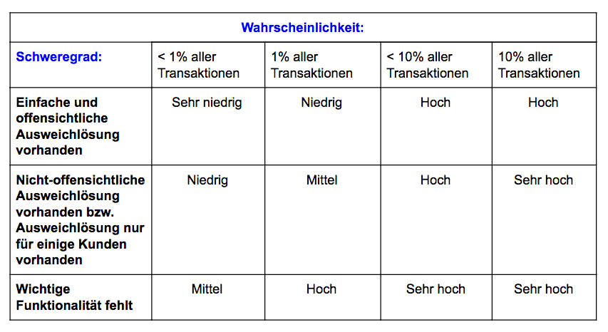 Zur Bemessung des Schweregrades eines Defects kann man überlegen, ob es eine Ausweichlösung gibt und ob sie offensichtlich ist oder eher schwer zu finden. Auf einer eCommerce-Seite gibt es unter Umständen z.B. zwei “Jetzt kaufen”-Buttons aber nur einer davon funktioniert.
