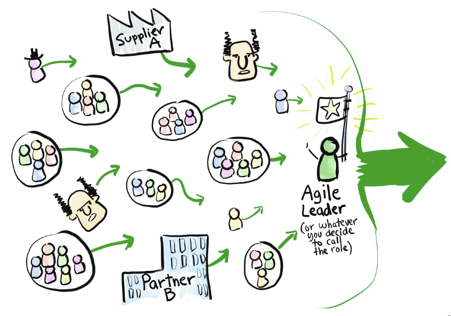 Jedoch kann man sagen, dass man eher einen dazu benannten Agile Leader benötigt, je mehr Leute und Teams involviert sind. Das muss jemand sein, dessen Vollzeit-Job es ist, sich zu kümmern – egal, ob es sich dabei um ein Projekt, ein Programm oder ein Produkt handelt, bei dem mehrere Teams beteiligt sind.