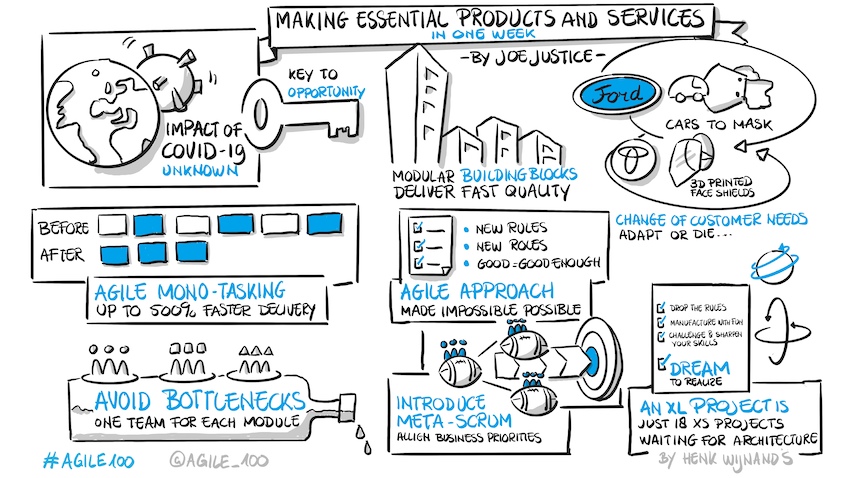 In a very special way Joe Justice finished the first Agile100 from his Tesla Model 3 Race Edition in a congenial way. His really complete Tesla presentation: “COVID Executive Response: How to pivot to making Essential Products and services in 1 week” shows not only how agility in hardware development works, but also that you can turn an entire business around within a few days.
