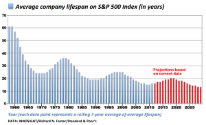 His talk did not only make a case for a fundamental change in leadership mindset e.g. “employees first, customers second”, but even more for a fundamental change what organizations should aspire to be: more adaptable, more innovative, and more engaging places to work. There is no doubt that change has become and is becoming faster. The lifespan of products is getting shorter (think about how long we used our telephones and how long we use our smartphones today), so is the lifespan of companies (see chart below).
