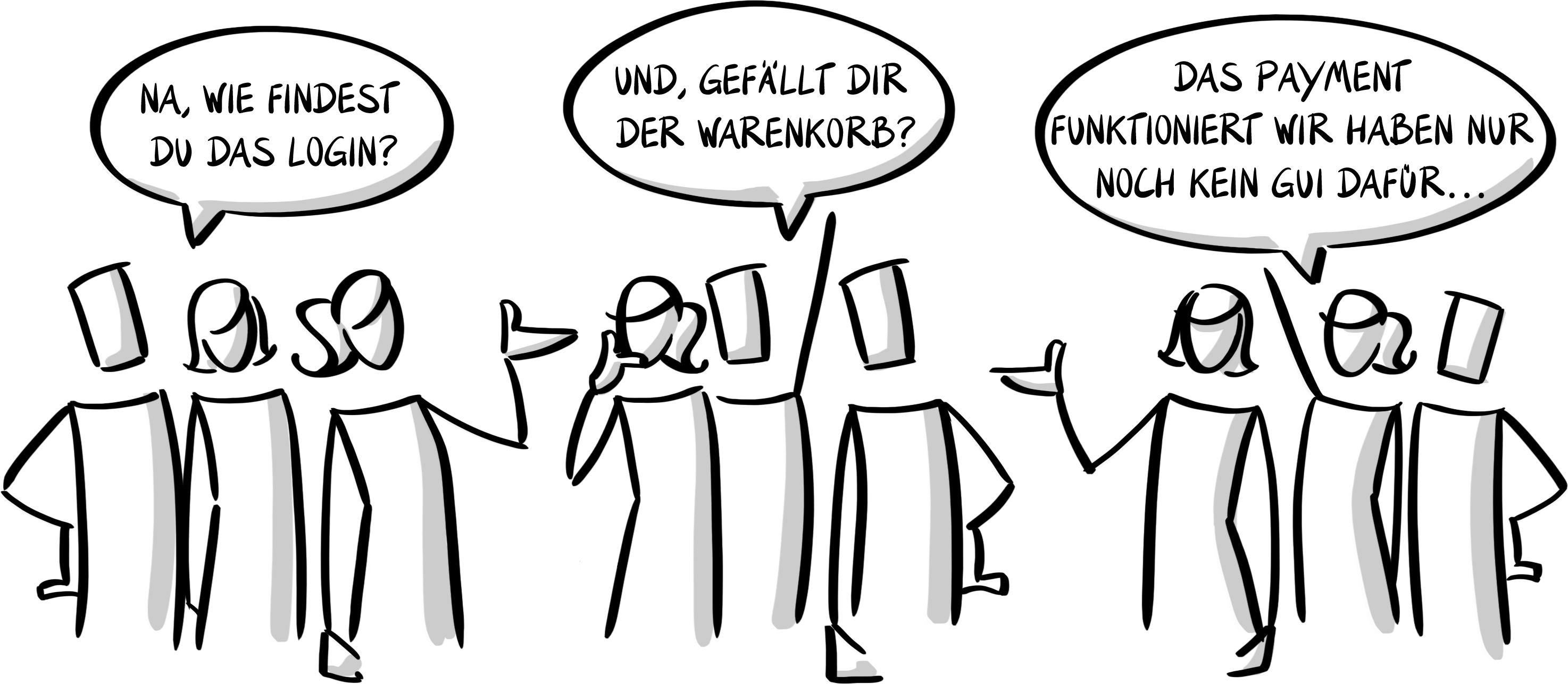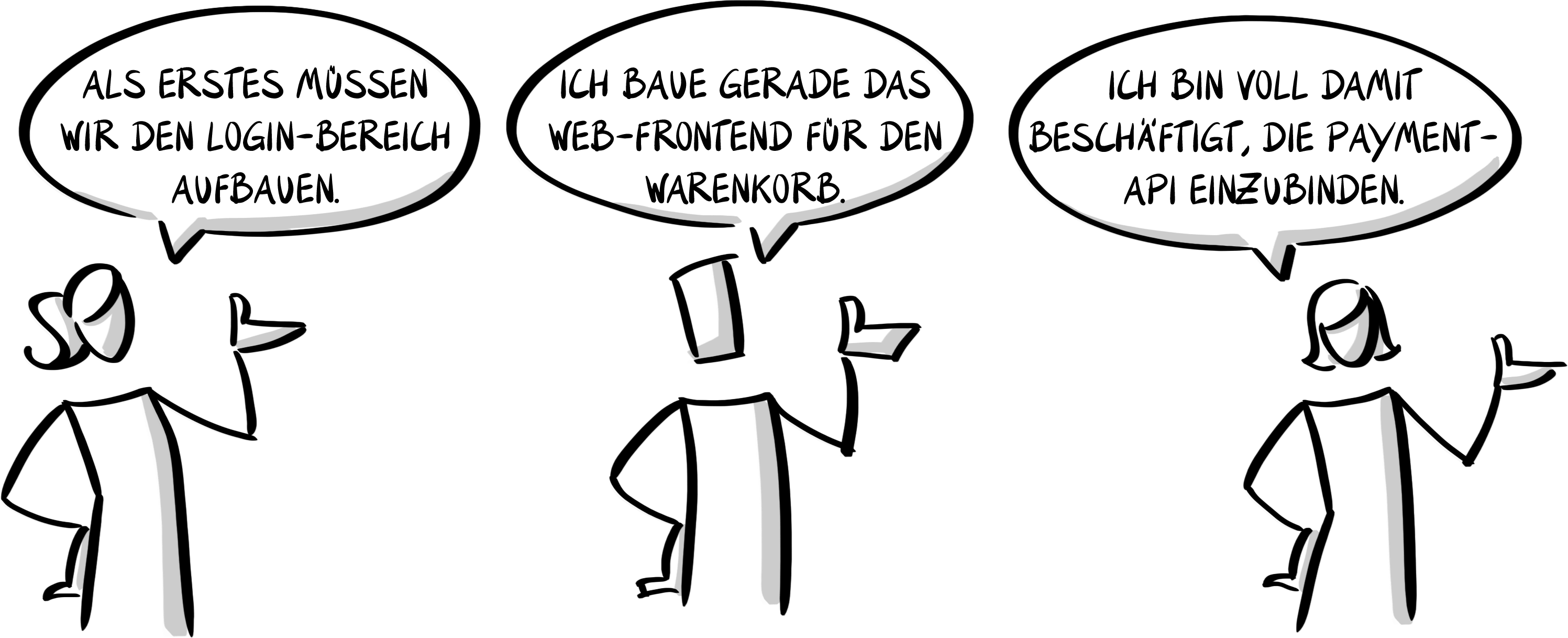 Ninguém sabe o que é importante no geral – cada um trabalha na sua própria direção. Em vez de se complementarem, todos otimizam o próprio trabalho e tentam alcançar os próprios objetivos. Se depois ainda faltar em cada equipe individual a visão do que é importante no todo, o resultado final também muitas vezes não gera valor para o cliente. Uma review entre equipes acaba acontecendo assim: