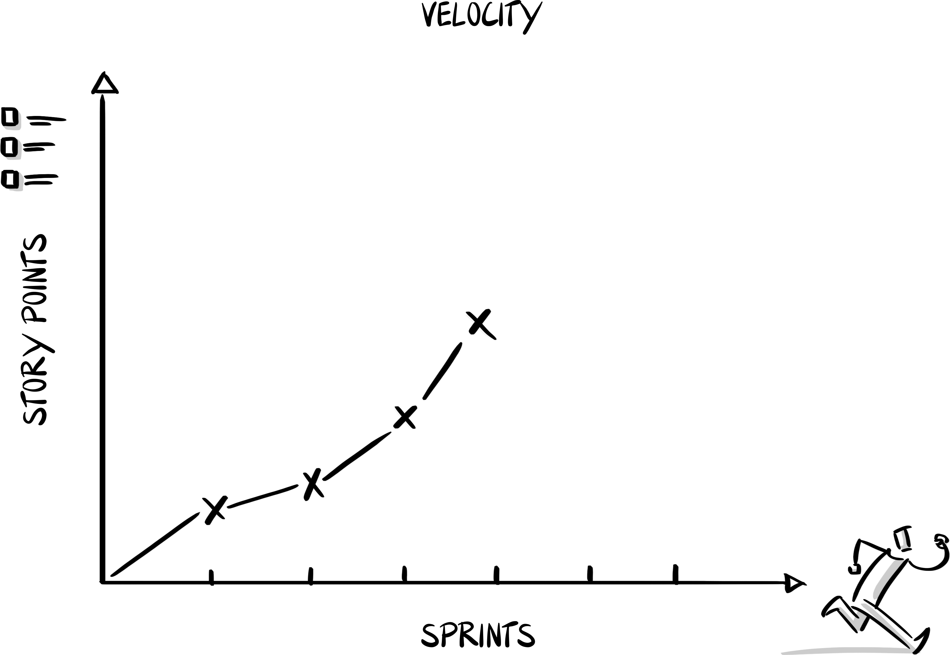 Se você quer medir a variação da Velocity para tirar conclusões e fazer previsões, registre os valores de Velocity dos respectivos Sprints em um diagrama: no eixo horizontal os Sprints consecutivos, no eixo vertical a Velocity. Naturalmente, a Velocity de um time vai oscilar especialmente no início. Porém, com um Development Team funcionando bem, você pode esperar um aumento constante da Velocity a médio e longo prazo.